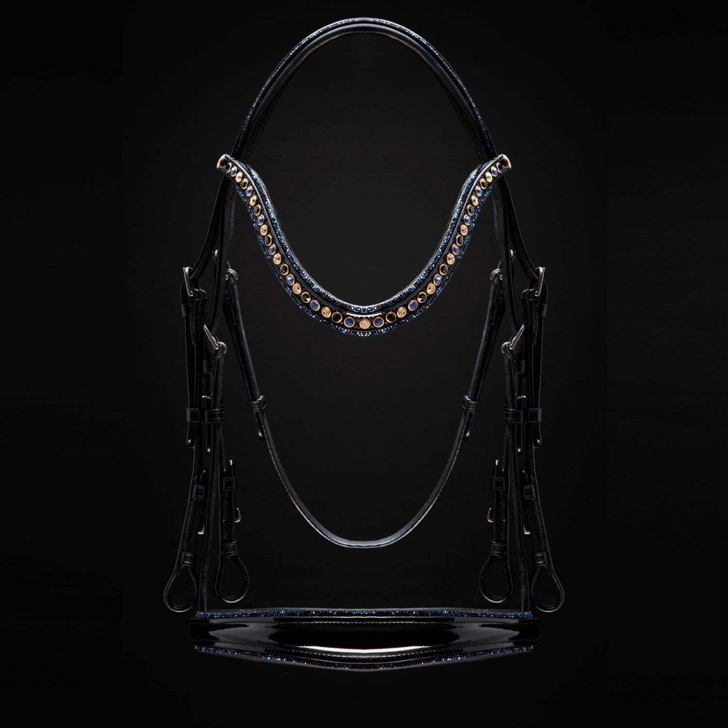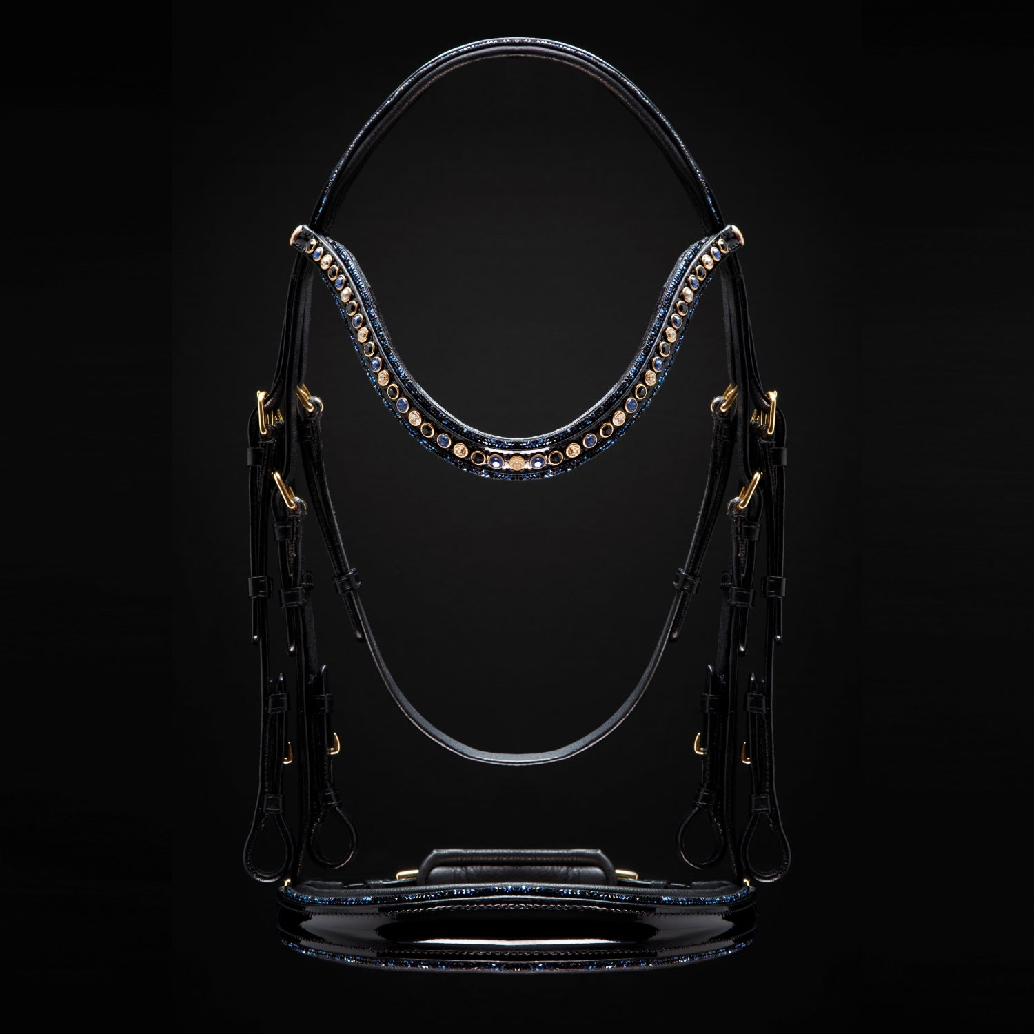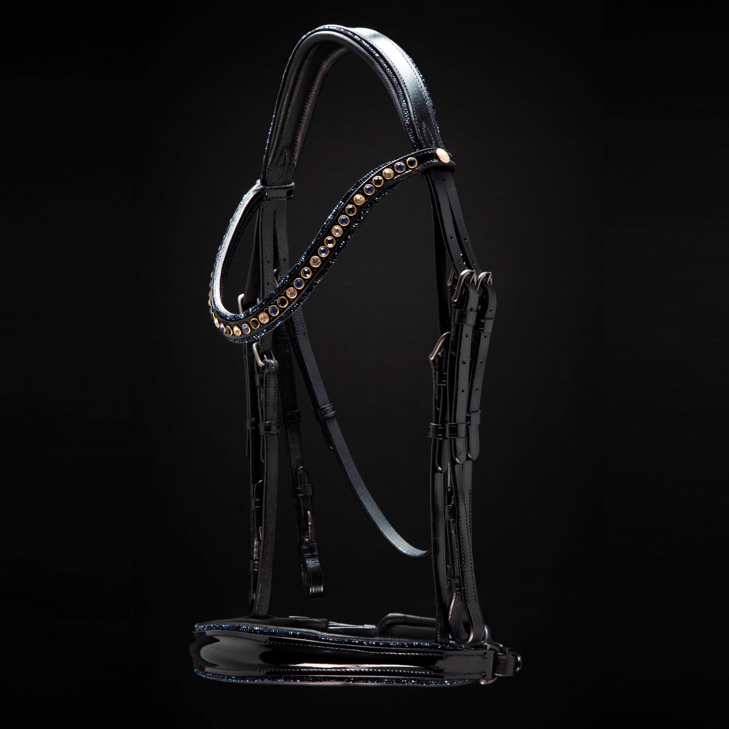 The patent leather browband and noseband provide the perfect backdrop for Austrian crystals in a gold setting on the browband while the crystal fabric on the noseband, browband and headstall accentuate your horse's best features.