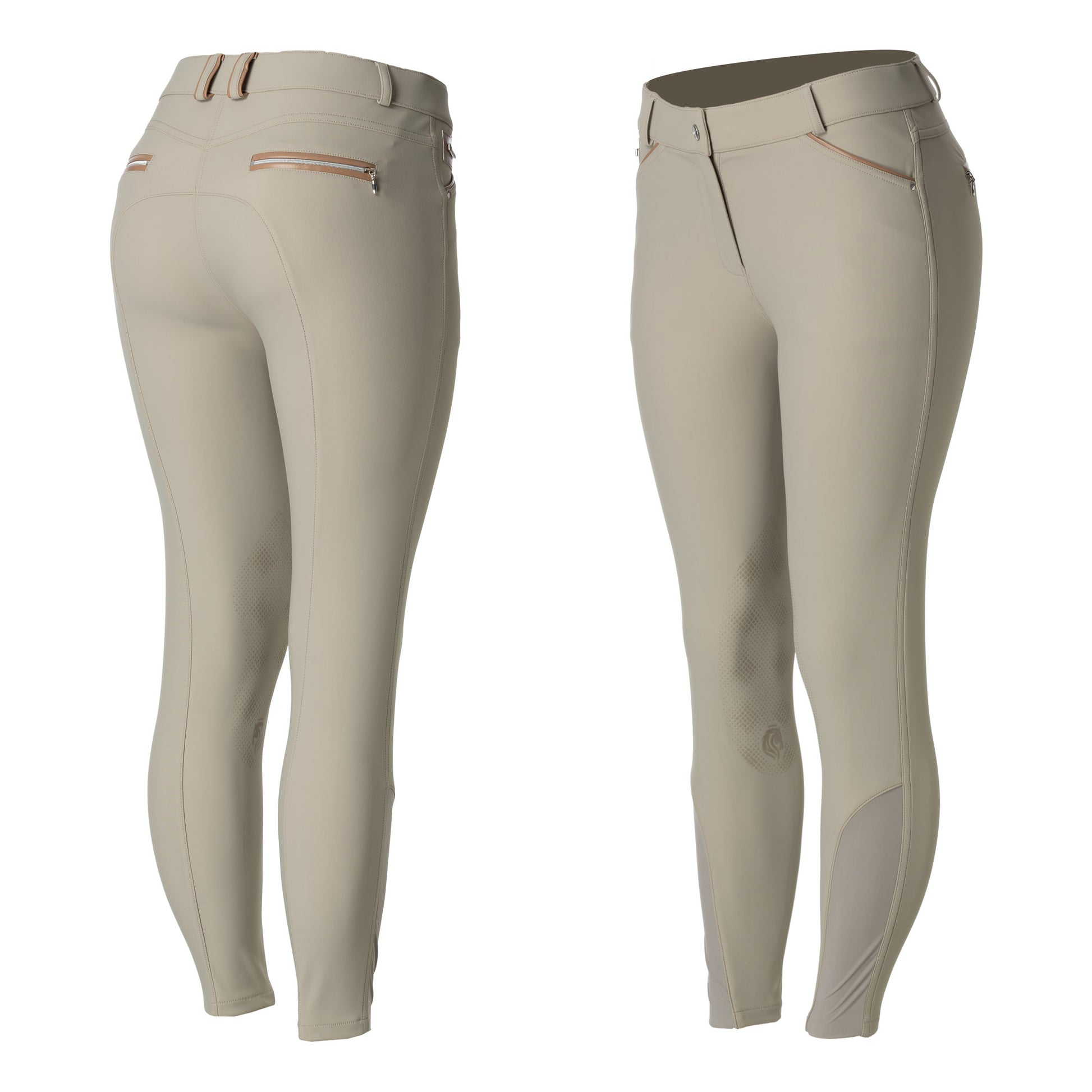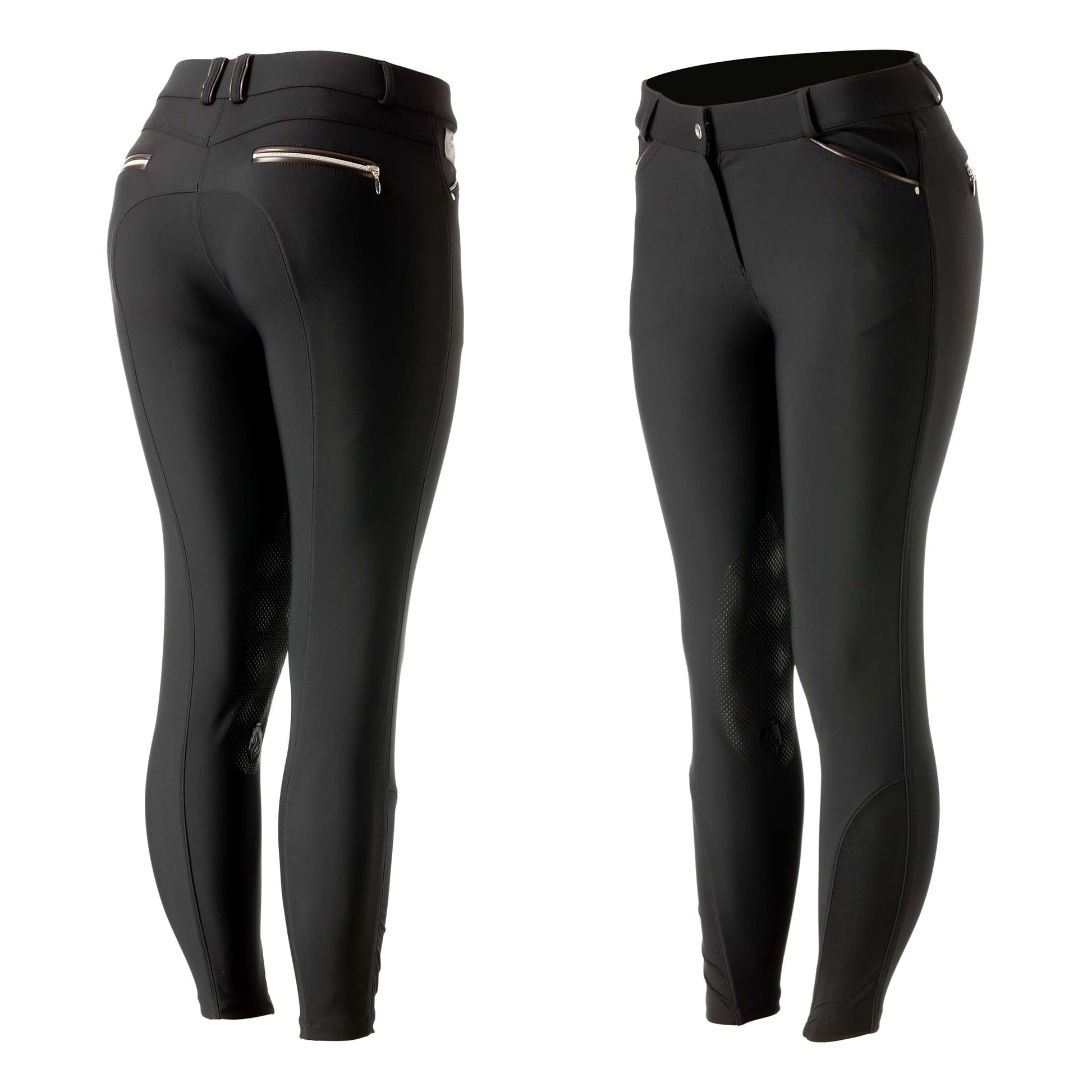 The Equinavia Elisabet Women’s Knee Patch Breeches, made from a bonded technical fabric, offer excellent shape retention, durability, and a smooth, debris-resistant exterior ideal for barn life. The mid-rise fit features a single Gutos hook slide closure, flattering faux leather trim, and faux back zip pocket details for a polished look. Deep front slash pockets fit a phone, while the power stretch sock bottoms ensure a secure fit under boots. Silicone knee patches and interior waistband grip help keep you secure in the saddle and your shirt neatly tucked in.