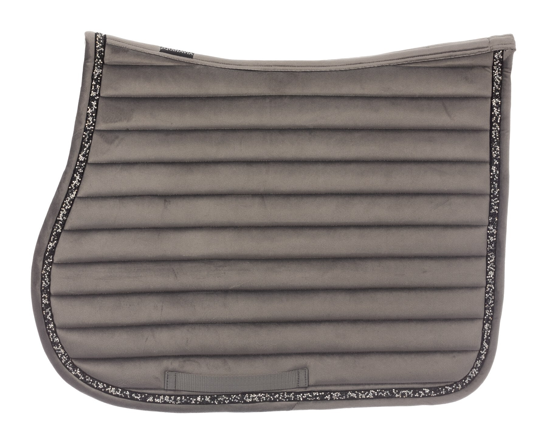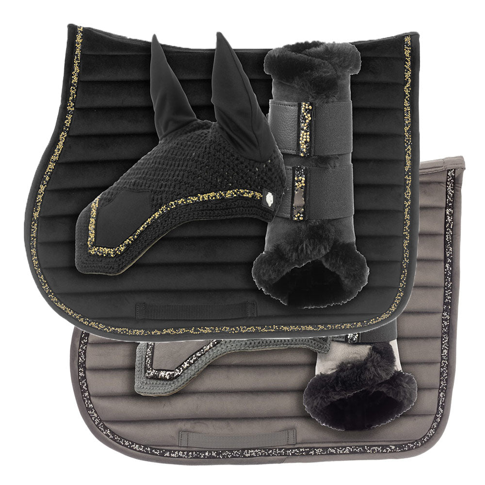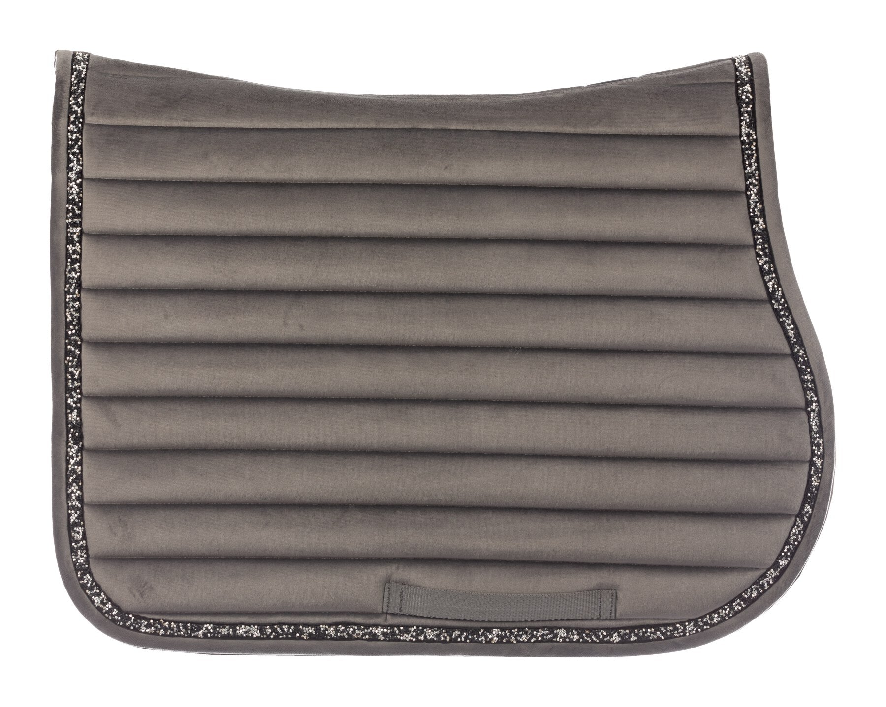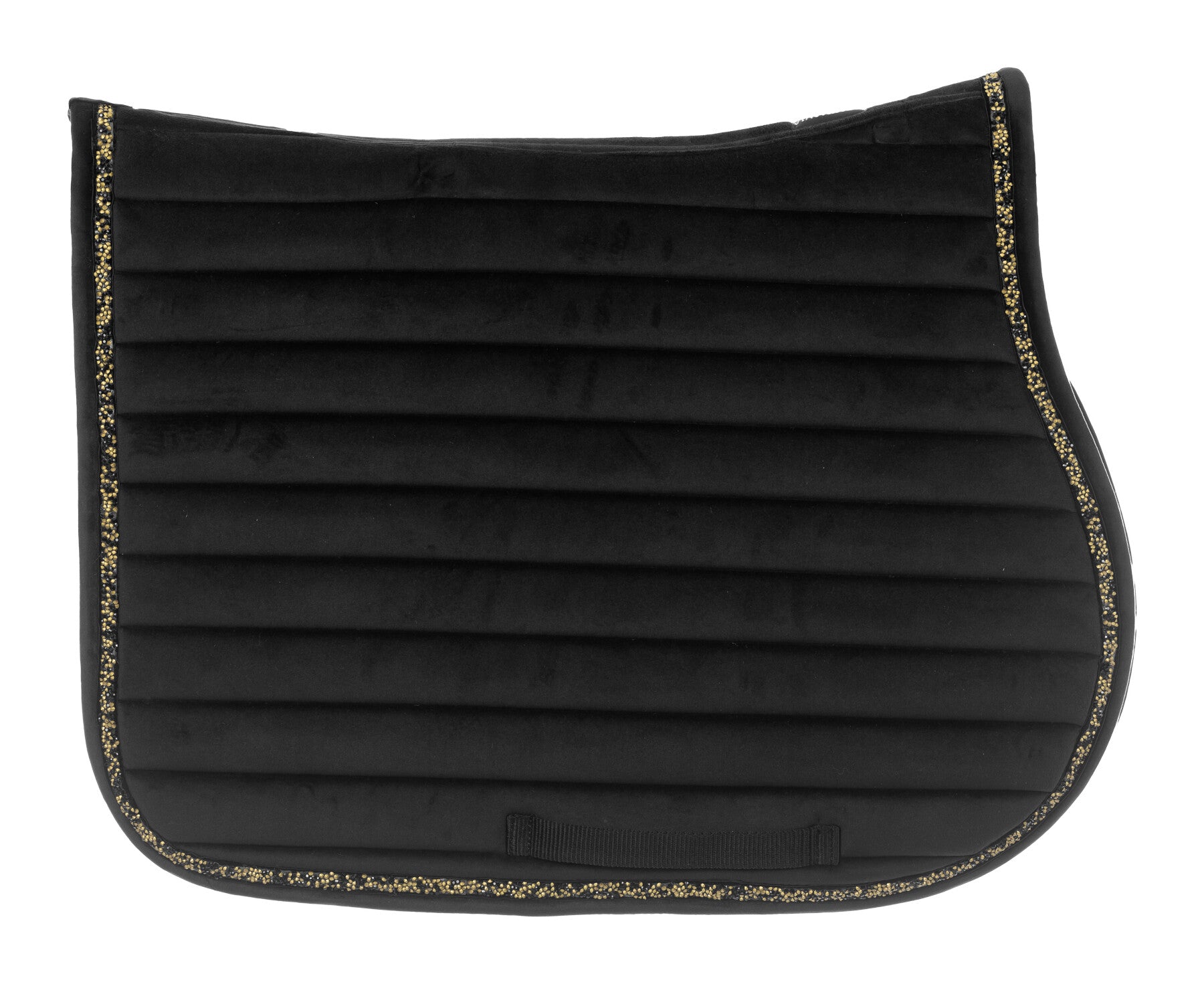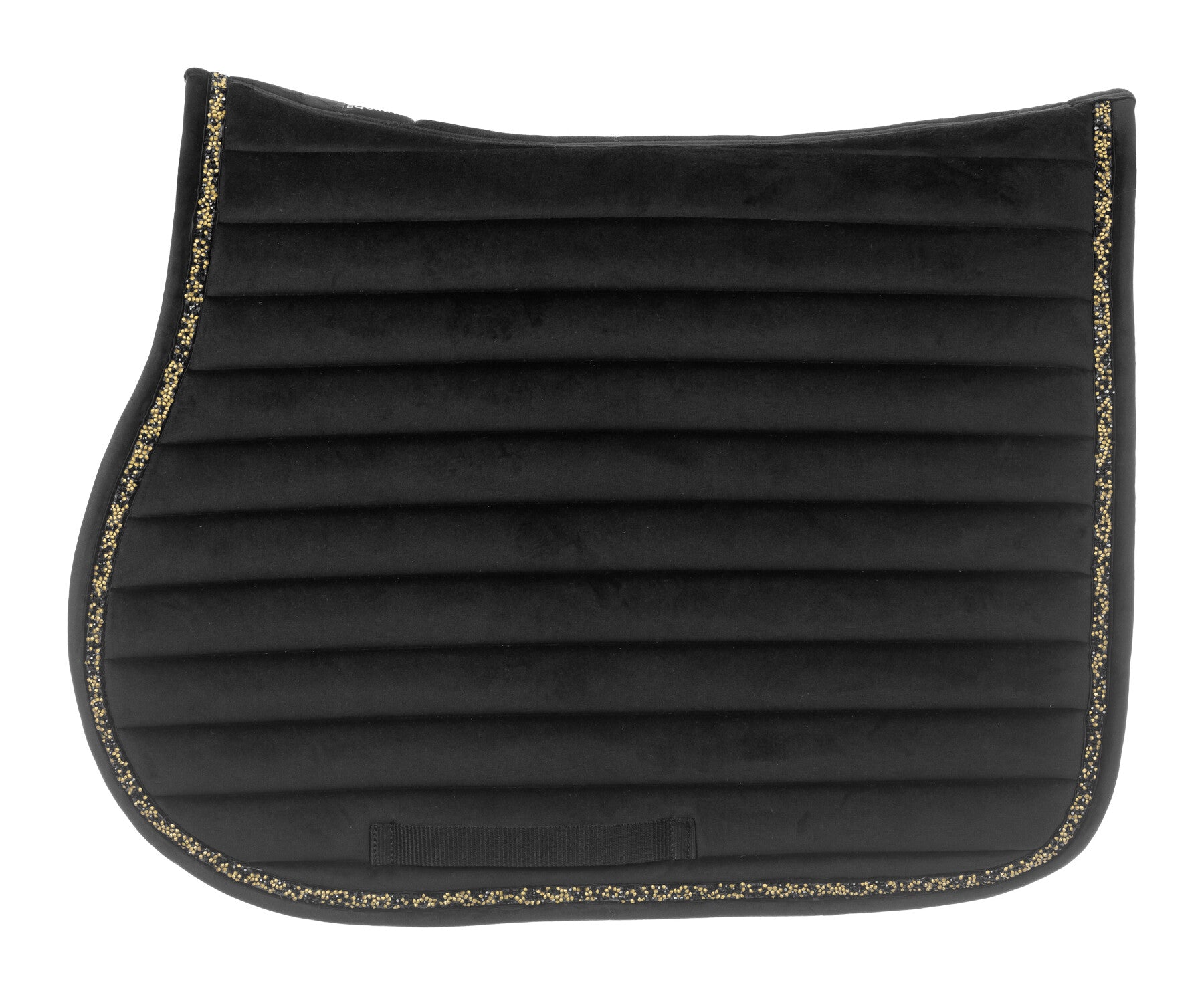 - Saddle pad: Channel quilted, luxurious velvet-like finish, fully trimmed in matching crystal mesh, contoured wither and nylon girth loop