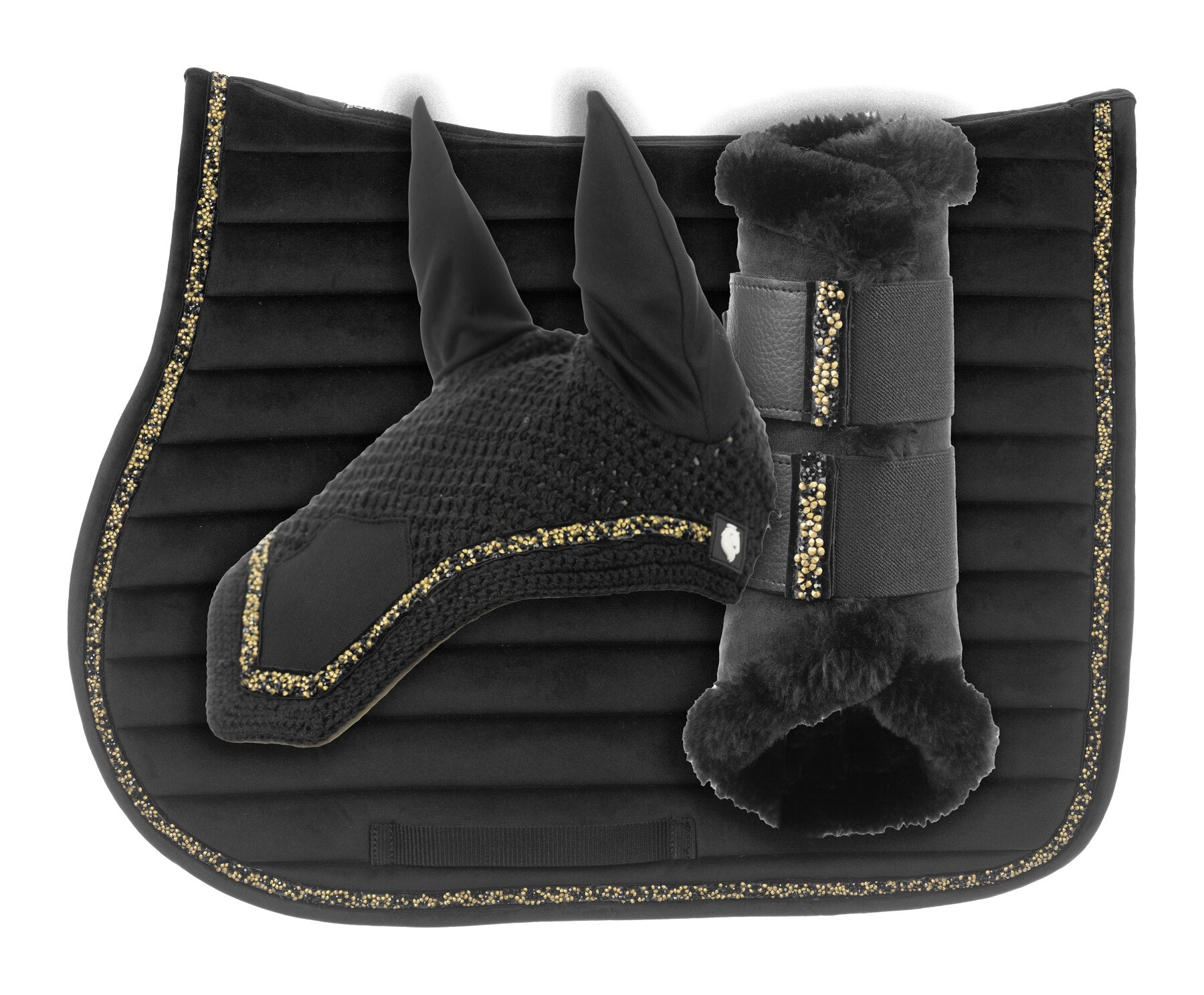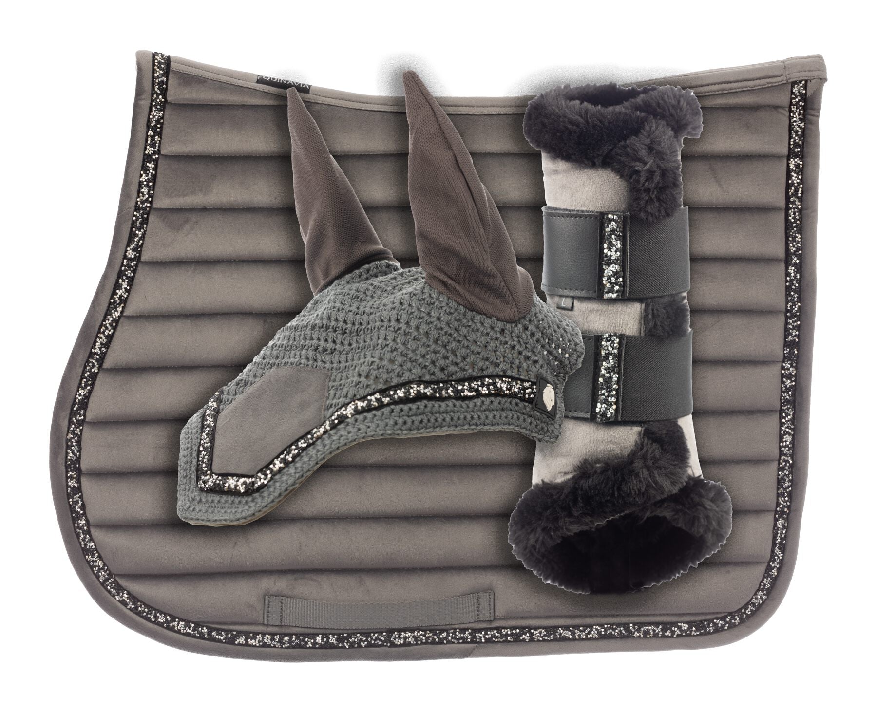 - Each set contains a saddle pad and matching bonnet and brushing boots accented with coordinating trim