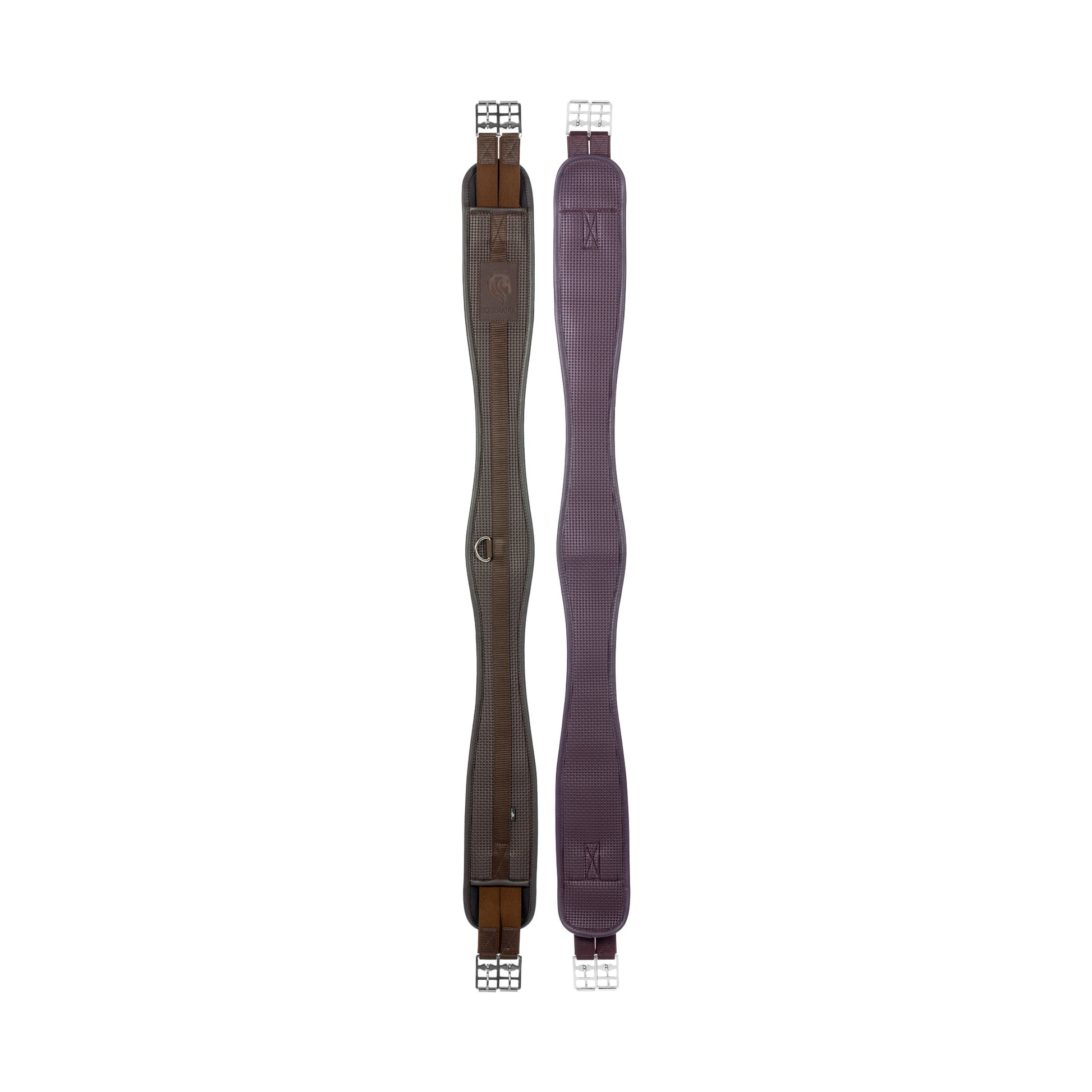The Equinavia Saga Non-Slip Long Girth is crafted from textured PU material for easy maintenance and slip resistance. Its contoured design, wider in the middle and narrowing at the elbow, ensures a secure fit. Fully bound edges provide a smooth contact area for the horse, while stainless steel hardware, a center D-ring, and double elastic at both ends enhance functionality. Available in brown with brown elastic for all-purpose use.