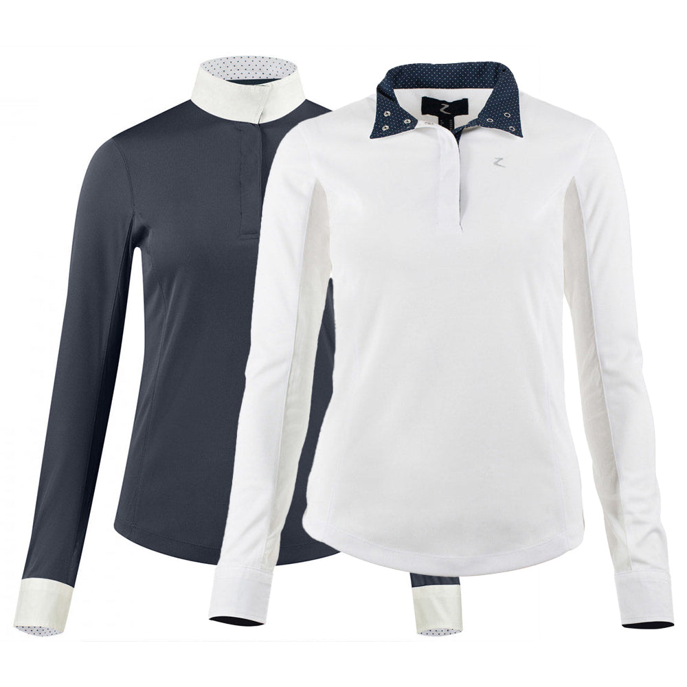 This beautiful and classy show shirt is designed with your comfort and performance in mind. Featuring many technical details like the soft and stretchy fabric with added UV protection, mesh under arms for excellent breathability, quick-drying material, and a fitted style, this stylish competition shirt looks and feels great under your show coat. Choose from a variety of unique or traditional colors and enjoy the fun print inside the collar. The hidden snap buttons on the collar and sleeve cuffs create a smooth, pulled together look that's perfect for the show ring.