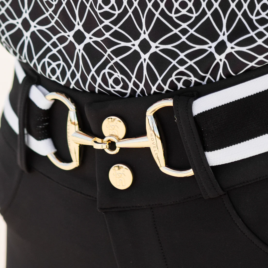 The Novella Black and White Stripe Snaffle Belt (1.5 in width) features an etched gold snaffle with the Novella logo to match every one of your Novella styles. This piece really ties your Novella Raymeister look together! The elastic is 1.5 inches wide for great support and stunning finished look. The Black and White combo is stunning!